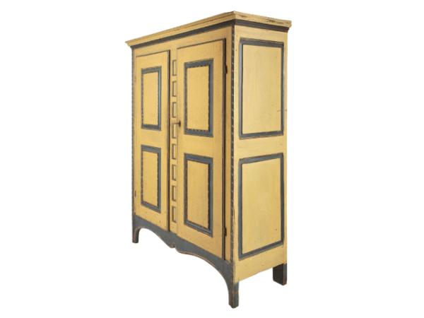 The 72-inch-tall “Armoire Crocodile” in exceptional polychrome paint featured a layered dentil cornice, deeply molded raised panels on the doors, two raised panels on each side, a shaped base, and eight recessed panels on the center stile. The yellow paint was in dramatic contrast with the deep blue found on the moldings, panel edges and lower rail.