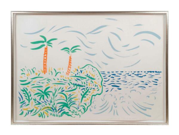 A color lithograph on paper by the acclaimed British artist David Hockney (b. 1937), titled Bora Bora, climbed to $47,795, and original artworks by American artists Thomas Wilmer Dewing and William Worcester Churchill posted identical prices of $39,325 in three days of auctions held June 15th-17th by Ahlers & Ogletree, online and live in the new Upper West Side gallery.