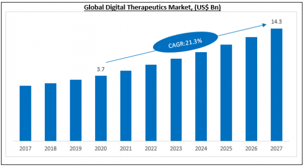 The Global Digital Therapeutics Market was valued at USD 3.7 billion in 2020, and it is expected to reach USD 14.3 billion by 2027, with a CAGR of 21.3 %, during the forecast period-2021-2027.
