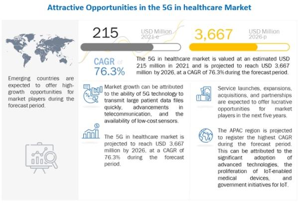 According to the new market research report "5G in Healthcare Market by Component (Hardware, Connectivity, Services) Application (Remote Patient Monitoring, Connected Medical Devices, AR/VR, Connected Ambulance, Asset Tracking) End User (Healthcare Providers, Payers) - Global Forecast to 2026", published by MarketsandMarkets™, the 5G in Healthcare Market is projected to reach USD 3,667 million by 2026, at a CAGR of 76.3% between 2021 and 2026. Growing demand for advanced healthcare monitoring systems, remote patient monitoring (RPM), and telemedicine services has been driving the market growth.