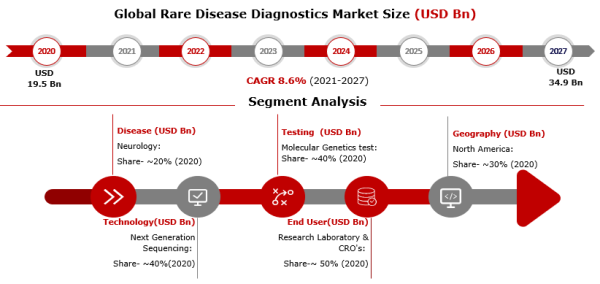 The objective of the study is to define Rare Disease Diagnostics market sizes of different segments & countries in recent years and to forecast the values to the coming years. The report is designed to incorporate both qualitative and quantitative aspects of the industry within each of the regions and countries involved in the study. The Rare Disease Diagnostics Market size was valued at US$ 19.5 Bn in 2020 and is expected to grow at a compound annual growth rate (CAGR) of 8.6% for the forecast period ending 2027 reaching a Market value of US$ 34.9 Bn.